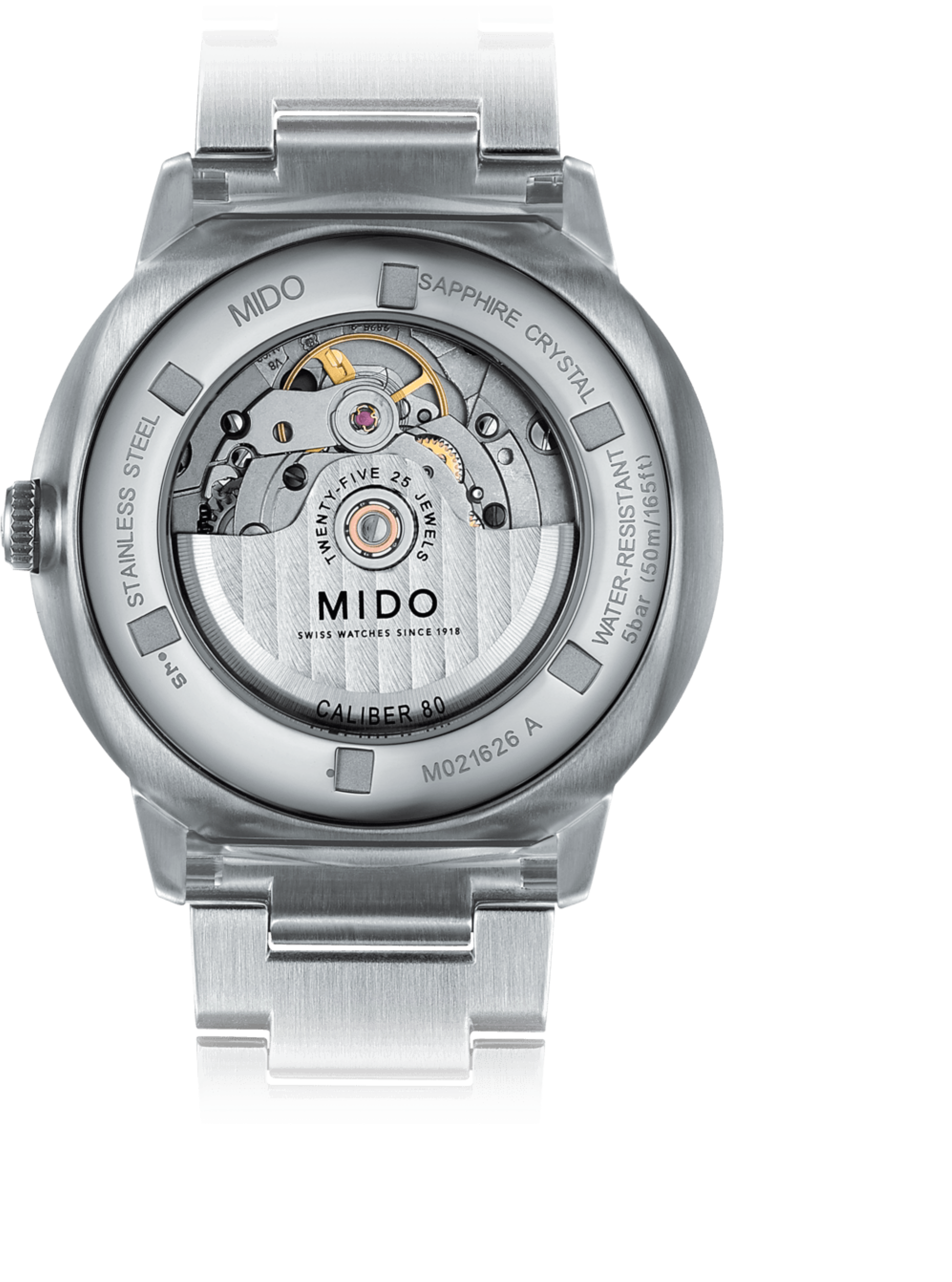 Funkce:Čas, velký čitelný datum, strojek Swiss Mido caliber 80 (Eta C07.651) - vyráběn firmou Eta exklusivně pro Mido = 25 kamenů (krokové ústrojí ocel/kámen), rezerva chodu 80 hodin, polokmity setrvačky 21.600/h = přesnost chodu 3 - 5 vteřin denně (nižší polokmity setrvačky jsou vyladěny jemnou regulací na věnci setrvačky pro maximální přesnost strojku), ozdobně lapovaný rotor samonátahu, automatický nátah (pohyb ruky) + ruční nátah (hodinky lze také natahovat i korunkou), průhledné zadní víčko pro náhled na strojek, zapínání náramku - překlapávací spona (pevné praktické zapínání)