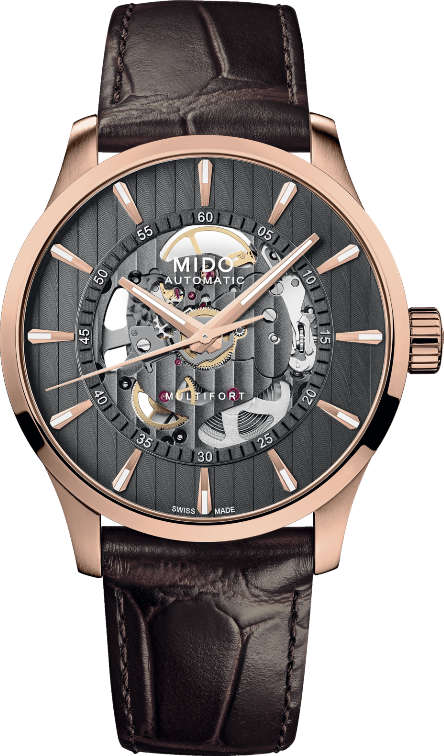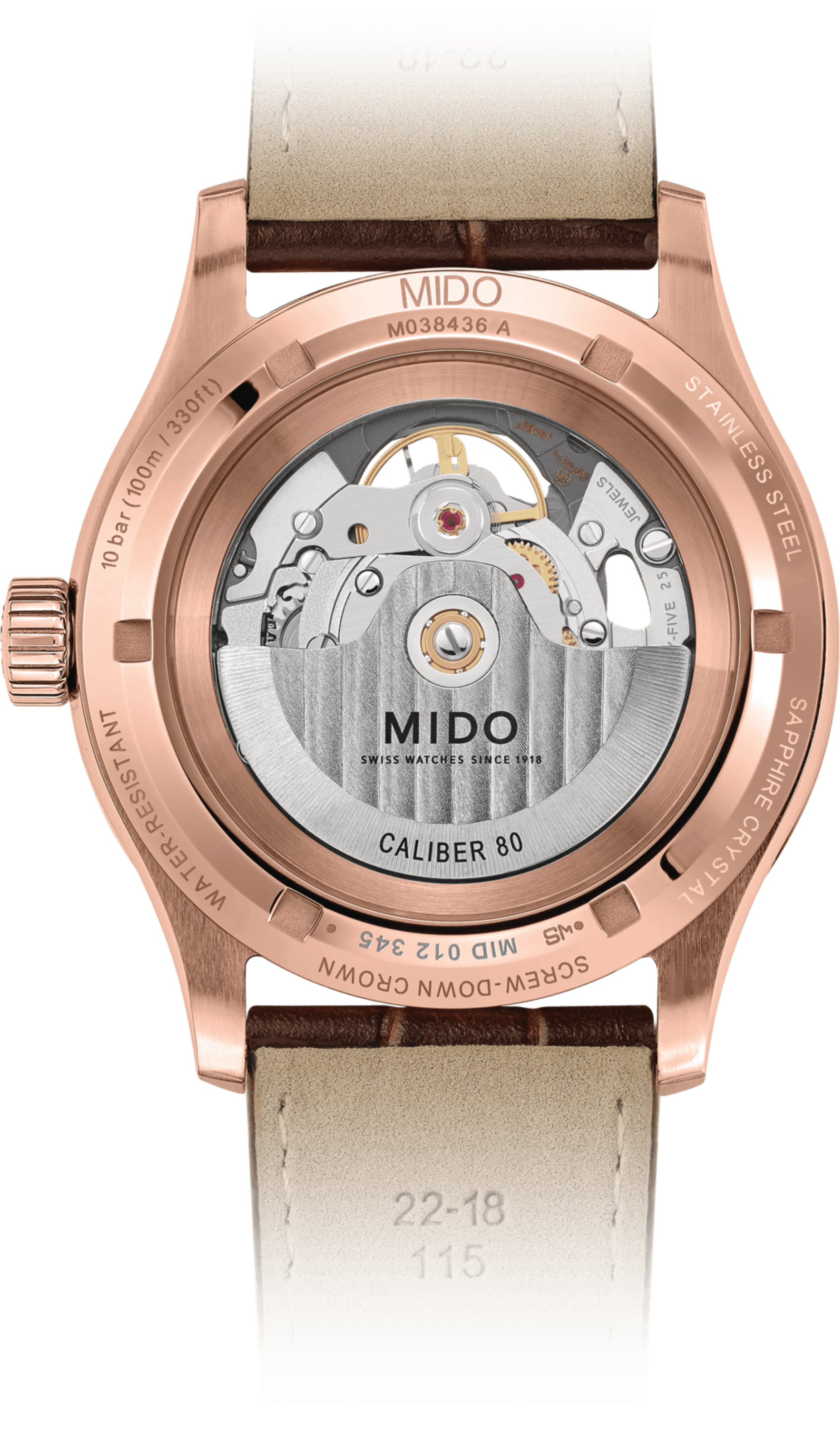 Funkce:Čas, strojek swiss Mido caliber 80 (základ ETA C07.631) - vyráběn firmou Eta exklusivně pro Mido = 25 kamenů (krokové ústrojí ocel/kámen), rezerva chodu 80 hodin, vlásek setrvačky je vyroben z materiálu Nivachron - velmi dobře odolává magnetickému poli (až 20x odolnější vůči magnetickému poli jak klasický slitinový vlásek) a díky tomu jsou hodinky přesnější a stabilnější v chodu, polokmity setrvačky 21.600/h = přesnost chodu 3 - 5 vteřin denně (nižší polokmity setrvačky jsou vyladěny jemnou regulací na věnci setrvačky pro maximální přesnost strojku), ozdobně lapovaný rotor samonátahu, automatický nátah (pohyb ruky) + ruční nátah (hodinky lze také natahovat i korunkou), průhledné zadní víčko pro náhled na strojek