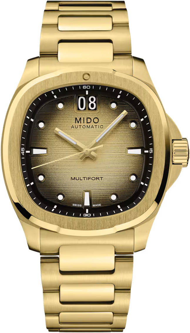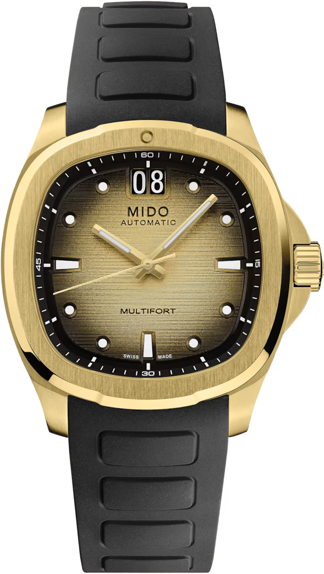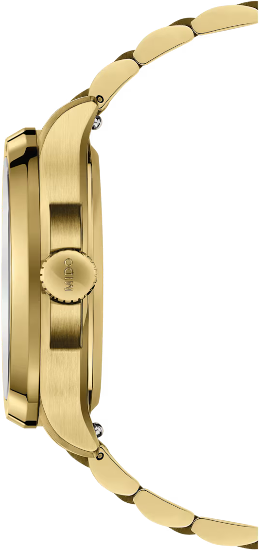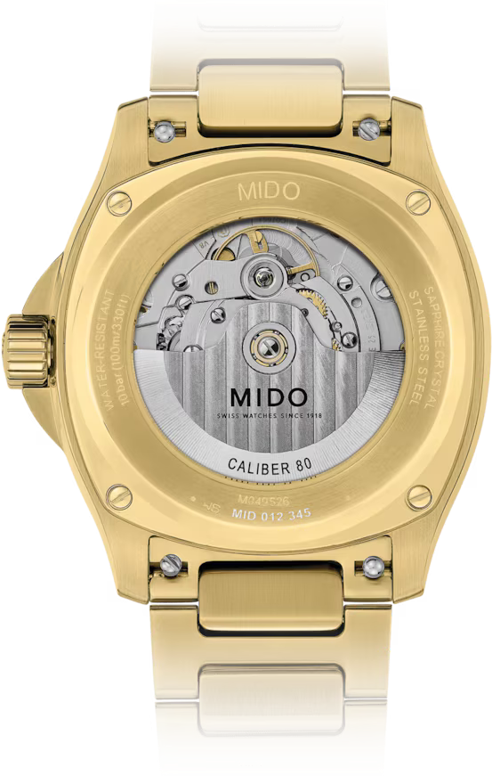 Funkce:Čas, datum, strojek swiss Mido caliber 80 (Eta C07.621) - vyráběn firmou Eta exklusivně pro Mido = 25 kamenů (krokové ústrojí ocel/kámen), rezerva chodu 80 hodin, polokmity setrvačky 21.600/h = přesnost chodu 3 - 5 vteřin denně (nižší polokmity setrvačky jsou vyladěny jemnou regulací na věnci setrvačky pro maximální přesnost strojku), krokové ústrojí ocel/kámen, ozdobně lapovaný rotor samonátahu, automatický nátah (pohyb ruky) + ruční nátah (hodinky lze také natahovat i korunkou), průhledné zadní víčko pro náhled na strojek