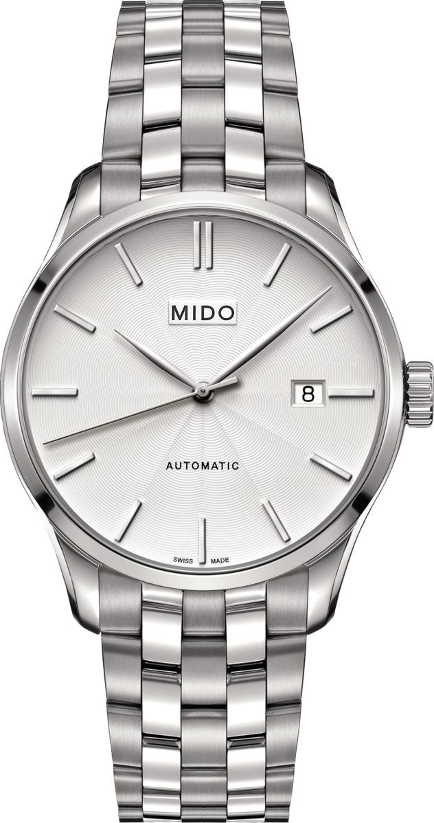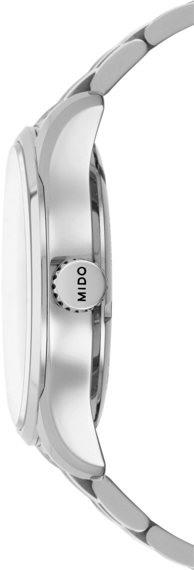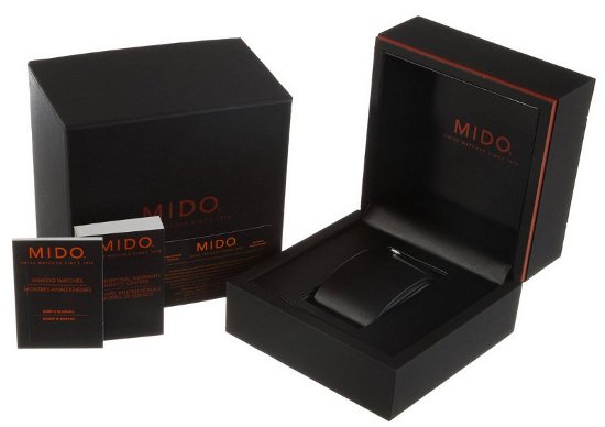 Funkce:Čas, datum, strojek swiss Mido caliber 80 ( Eta C07.611) - vyráběn firmou Eta exklusivně pro Mido = 25 kamenů (krokové ústrojí ocel/kámen), rezerva chodu 80 hodin, polokmity setrvačky 21.600/h = přesnost chodu 3 - 5 vteřin denně (nižší polokmity setrvačky jsou vyladěny jemnou regulací na věnci setrvačky pro maximální přesnost strojku), ozdobně lapovaný rotor samonátahu, automatický nátah (pohyb ruky) + ruční nátah (hodinky lze také natahovat i korunkou), průhledné zadní víčko pro náhled na strojek