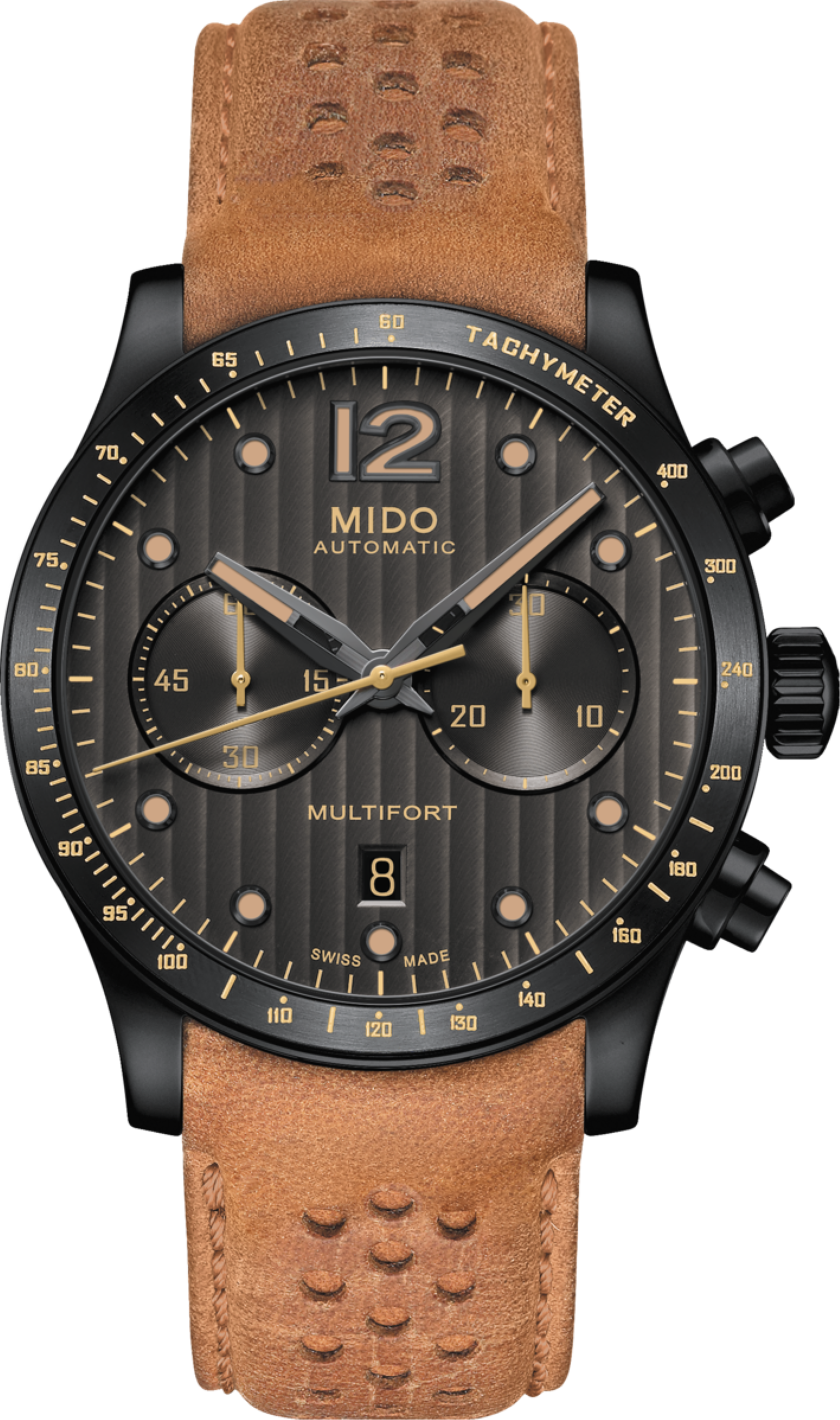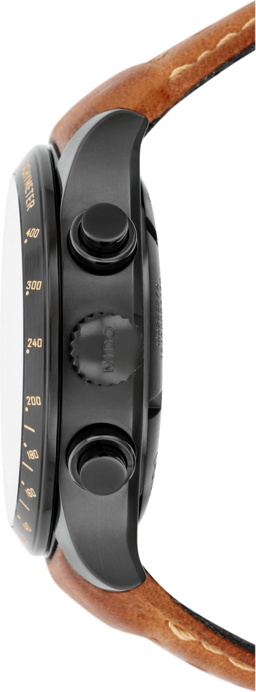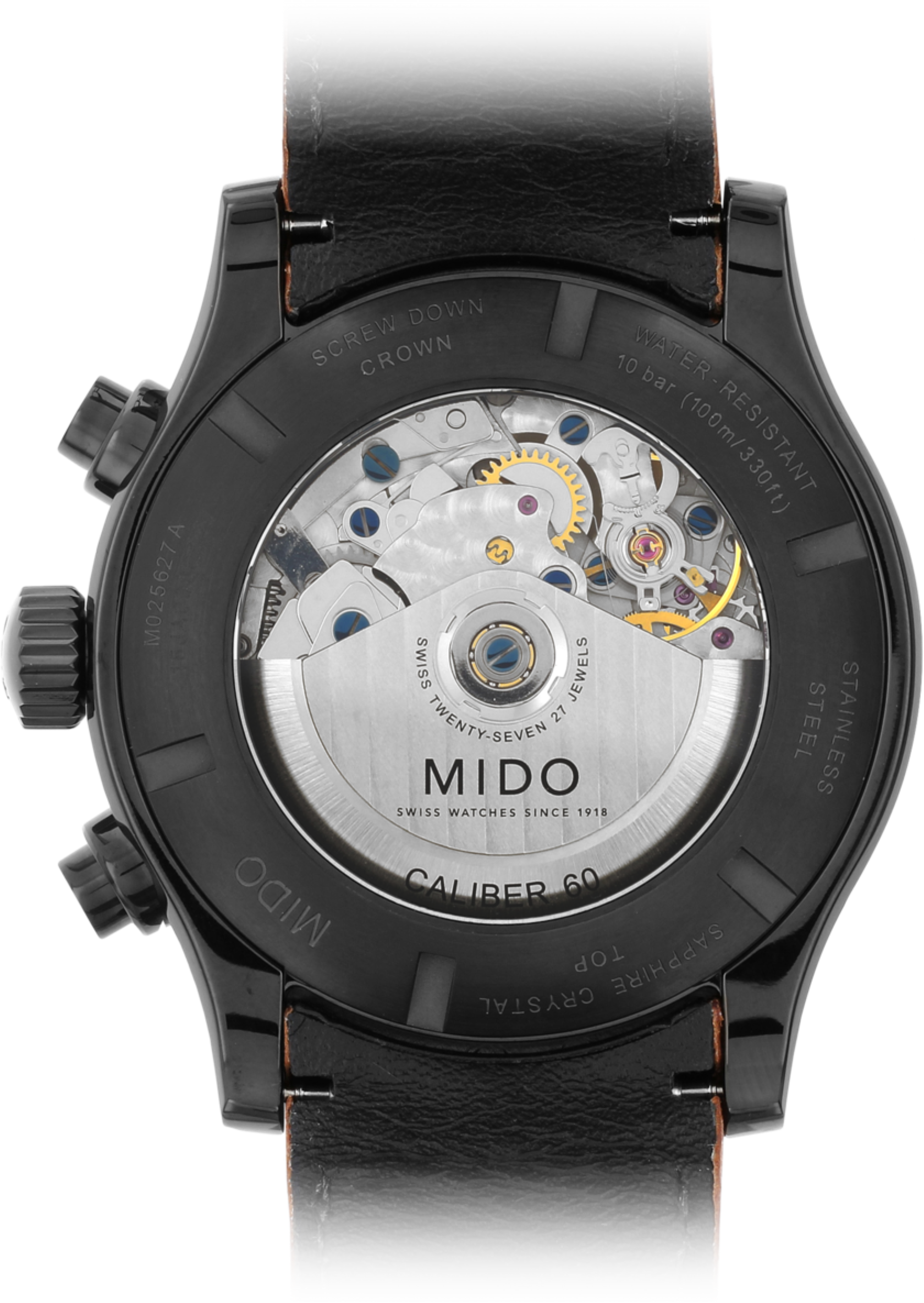 Funkce:Čas, datum, den v týdnu, chronograf = stopky (dva čítače), tachymeter = km/h, strojek Mido kalibr 60 (základ Eta Valjoux 7750 - 27 kamenů), rezerva chodu 60 hodin, polokmity setrvačky 28.800 za hodinu = přesnost chodu 2 - 4 vteřiny denně, automatický nátah (pohyb ruky) + ruční nátah (hodinky lze také natahovat i korunkou), ozdobně lapovaný rotor samonátahu a základny strojku + modřené šroubky, průhledné zadní víčko pro náhled na strojek, svítící ručičky a indexy (luminiscence), šroubovací vodotěsná korunka