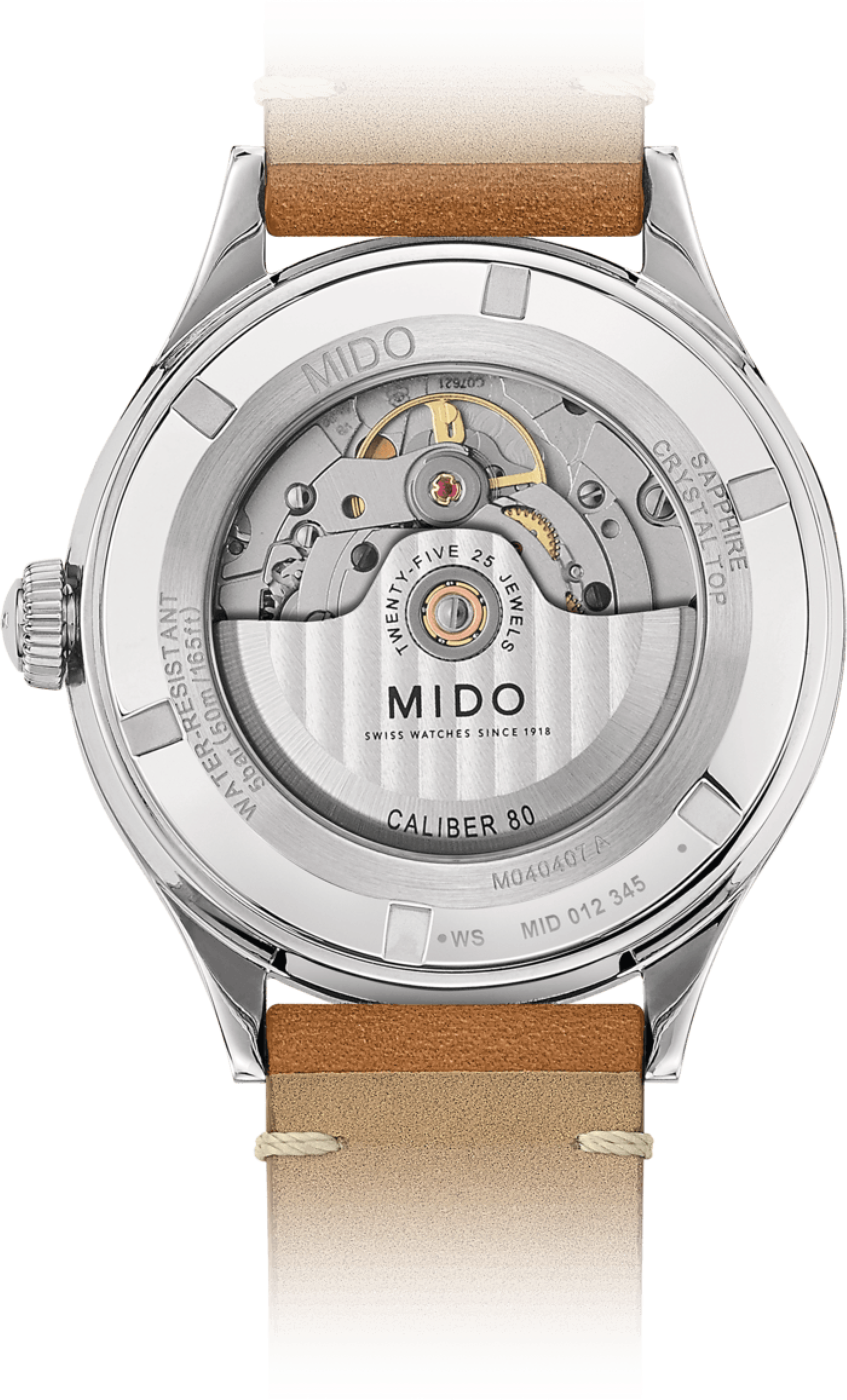 Funkce:Čas, datum, pulsmetrová stanice, strojek swiss Mido caliber 80 (Eta C07.621) - vyráběn firmou Eta exklusivně pro Mido = 25 kamenů (krokové ústrojí ocel/kámen), rezerva chodu 80 hodin, polokmity setrvačky 21.600/h = přesnost chodu 3 - 5 vteřin denně (nižší polokmity setrvačky jsou vyladěny jemnou regulací na věnci setrvačky pro maximální přesnost strojku), ozdobně lapovaný rotor, automatický + ruční nátah (hodinky lze také natahovat i korunkou), průhledné zadní víčko pro náhled na strojek, svítící ručičky a indexy, zapínání pásku - klasická spona (pevné praktické zapínání)
